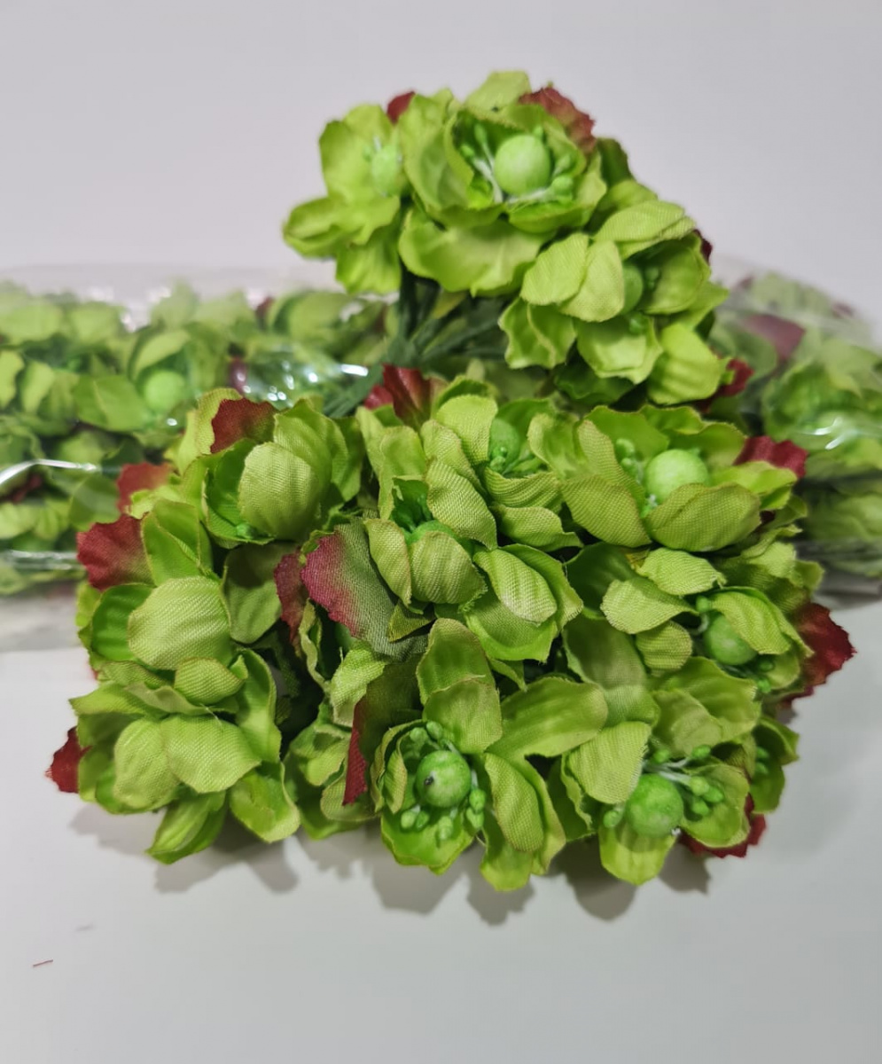 Цветы на ножке с круглой сердцевиной. Цвет зелёный. Ткань. Размер цветка 4-4,5 см. Букет 6 цветов. Упаковка 72 шт.