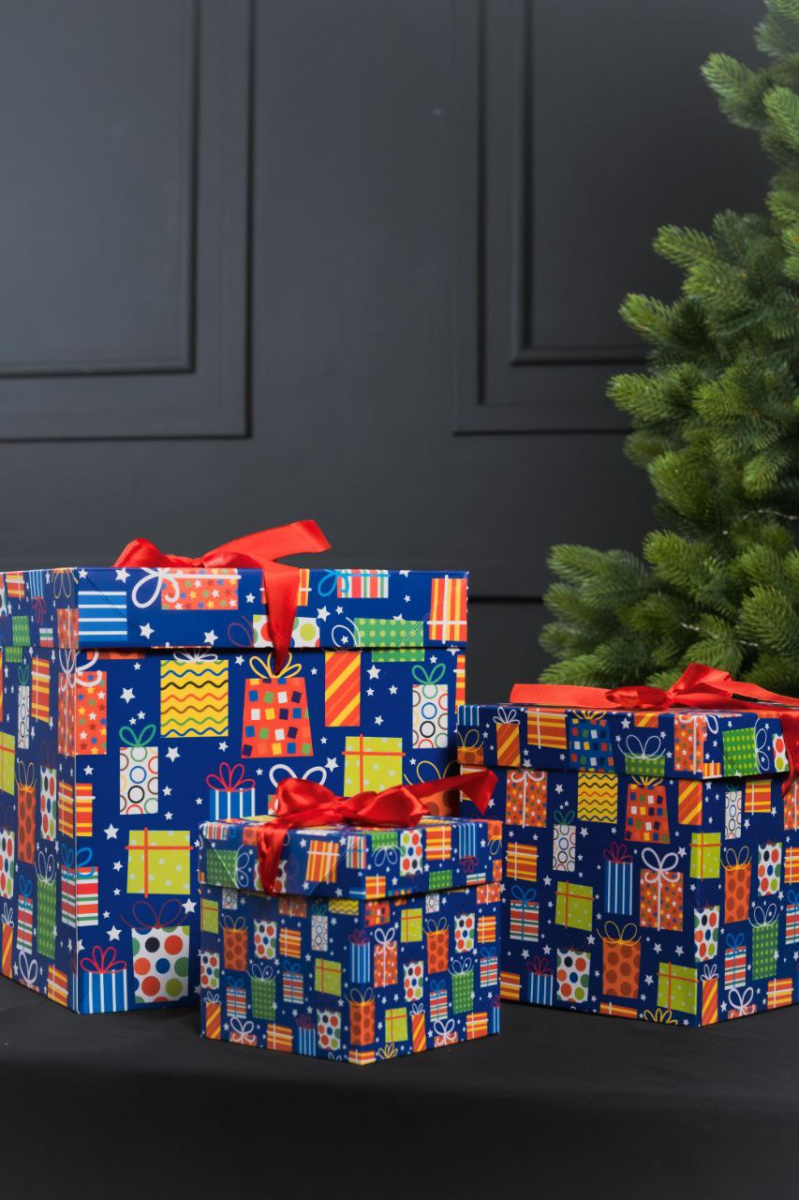 Набор коробок 3в1. Синий с подарками. Размер 10*10, 15*15, 22*22 см.