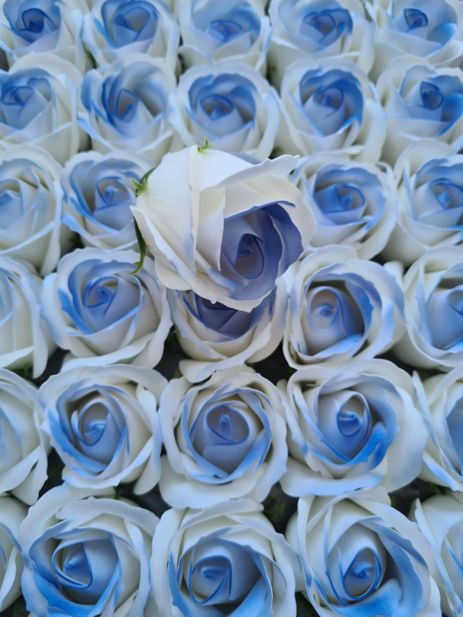 Декоративные розы 3-х слойные. Двухцветные. Белый с голубой обводкой. Уп-50 шт одного цвета
